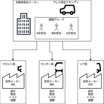 セルフ生産を基本とする金型メーカーは製作できる型生産量・型種が決まっています。そのため、自動車部品プレスメーカーはアセンブリ部品を分解して、複数の金型メーカーに金型を発注しなければならず、プレスメーカーの調達担当者は金型手配に多大な工数をかけています。