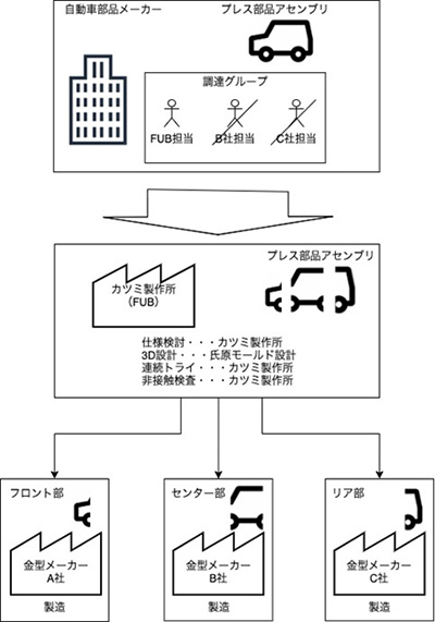 この問題に対し、これまでカツミ製作所が進めてきた設計と仕上を主体とする「セミファブレス工法」を引き続き採用し、カツミ製作所が所属する次世代金型企業組合「FuB(ファブ)」で手配工程から請け負う事で、FuBが責任者としてプロジェクトを進行し、金型を同時に設計〜生産します。プレスメーカーの手配コスト削減をご提案できるようになりました。